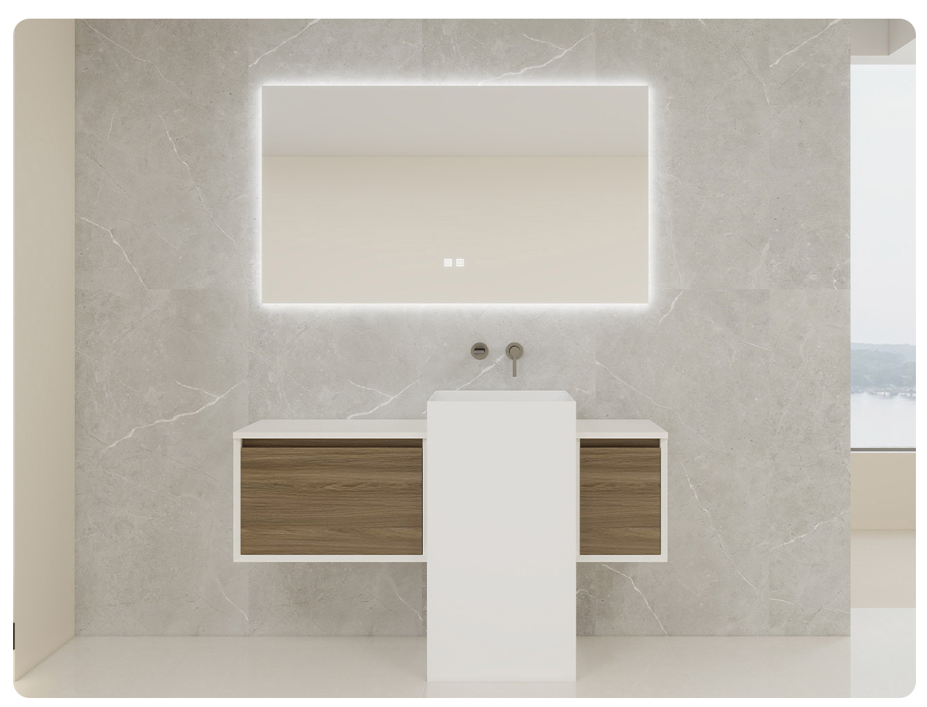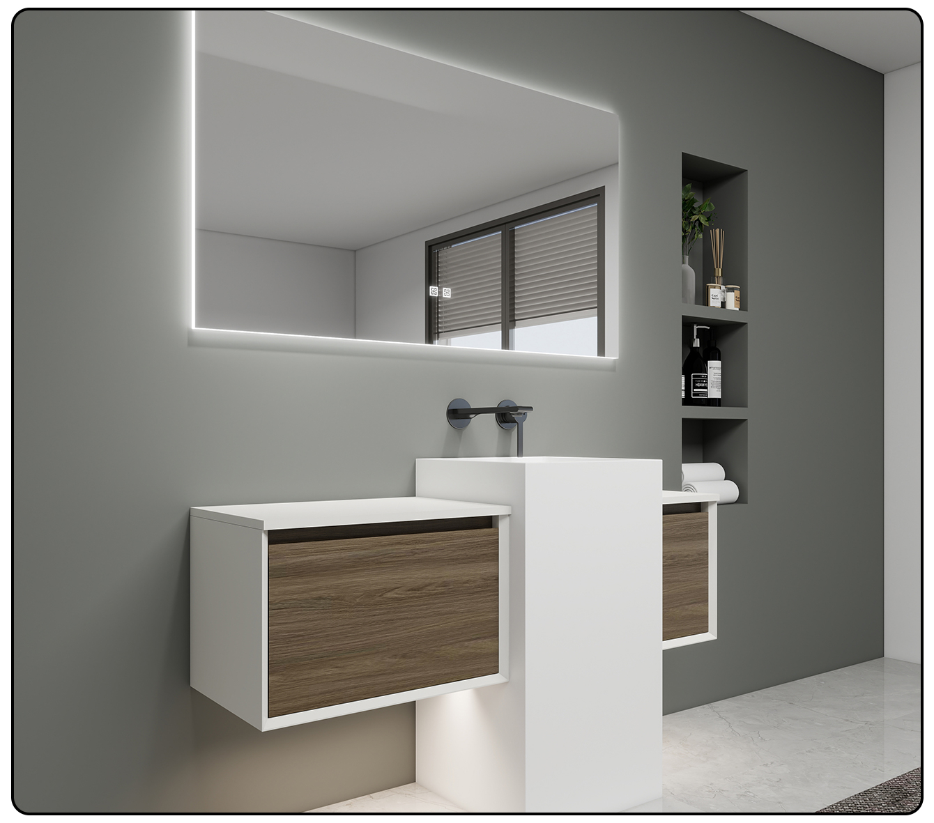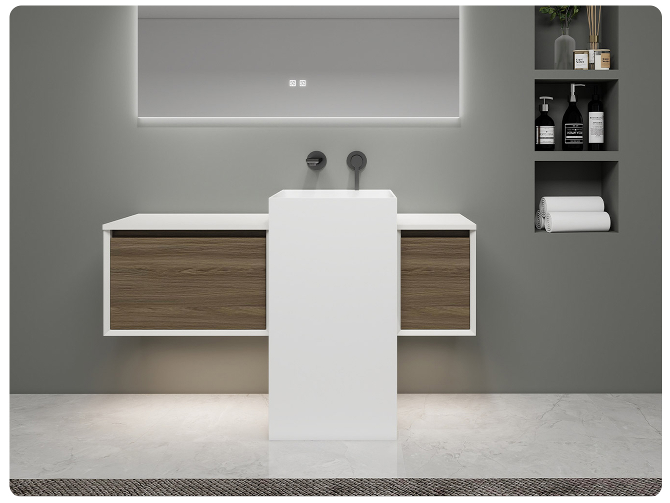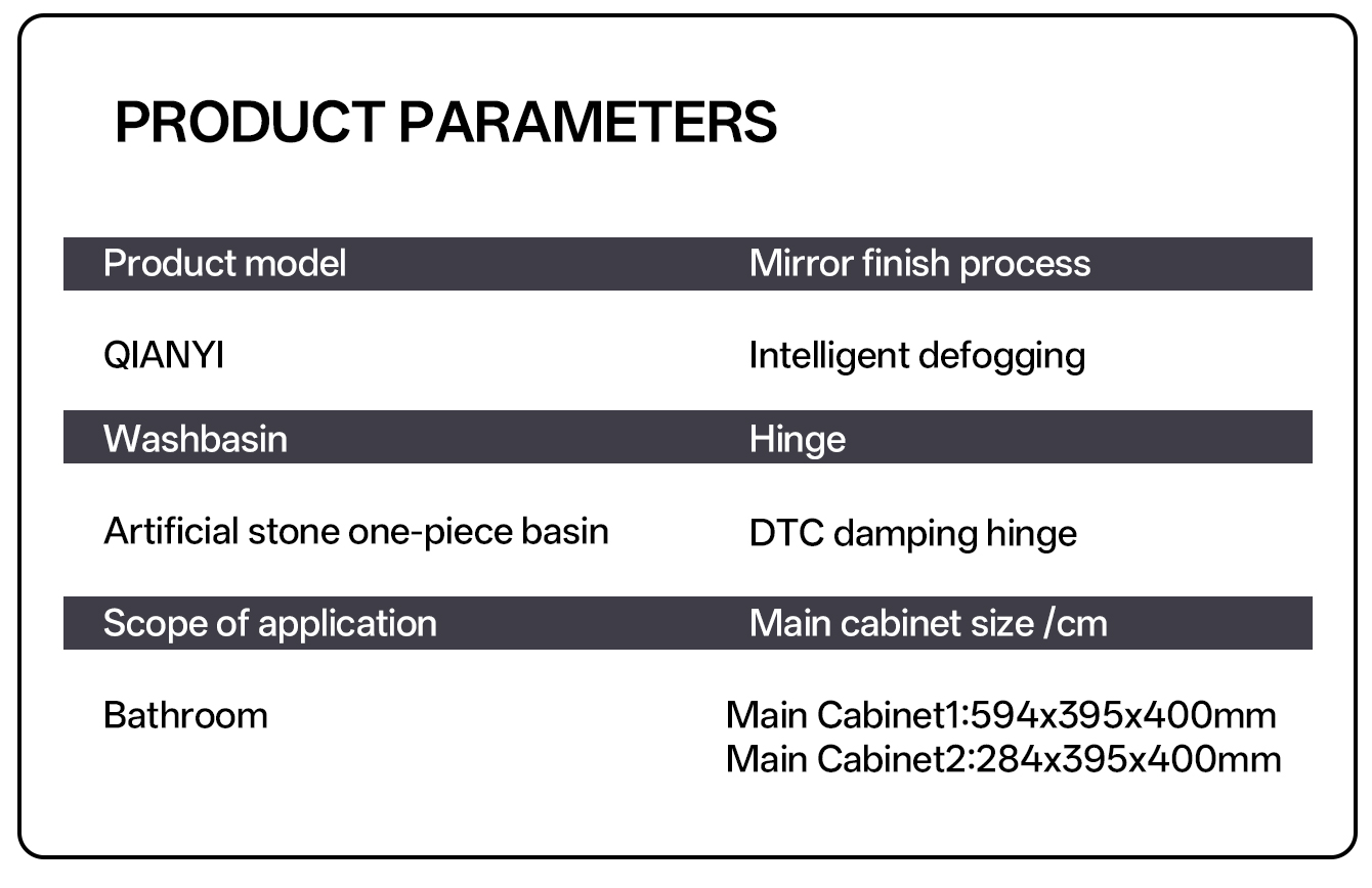 The simple and elegant line design perfectly matches various home decoration styles such as modern and light luxury. The scientific combination of the mirror cabinet and the layered base cabinet ensures that skin care products and toiletries are properly placed, keeping the countertop clean and tidy. The deepened washbasin is splash-proof, and the silent guide rail drawer opens and closes silently. Every detail is filled with humanized considerations.