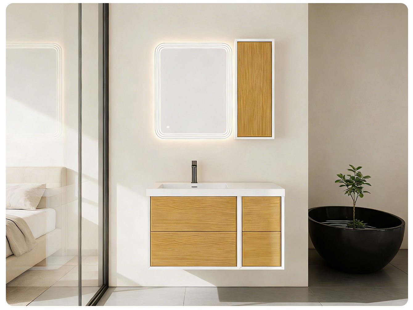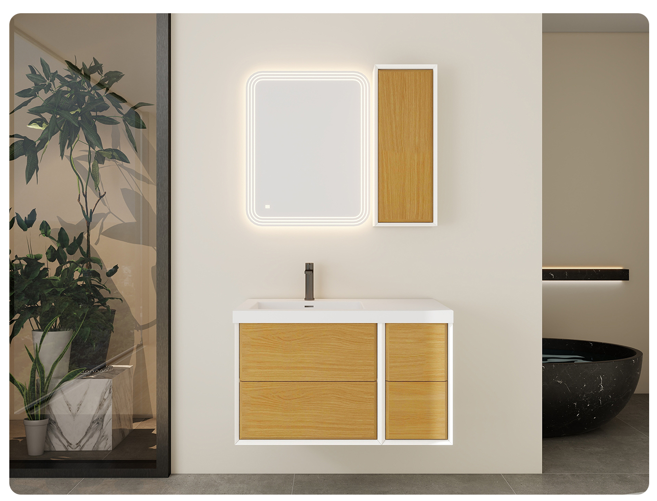 The design continues the essence of light luxury, with simple lines and metal trim pieces. The delicate cabinet texture exudes a sense of sophistication and can easily blend into various home decoration styles. Its highlight is its super large capacity. The stratified drawers and open storage areas are scientifically divided, and it is equipped with an optional smart mirror cabinet (with anti-fog and lighting functions) to meet the diverse storage needs of large-sized houses and keep the space clean and orderly.