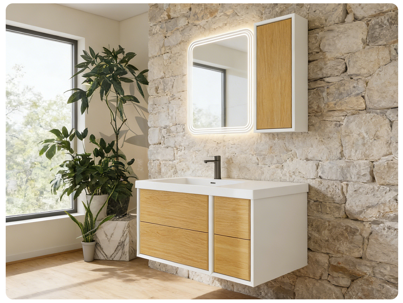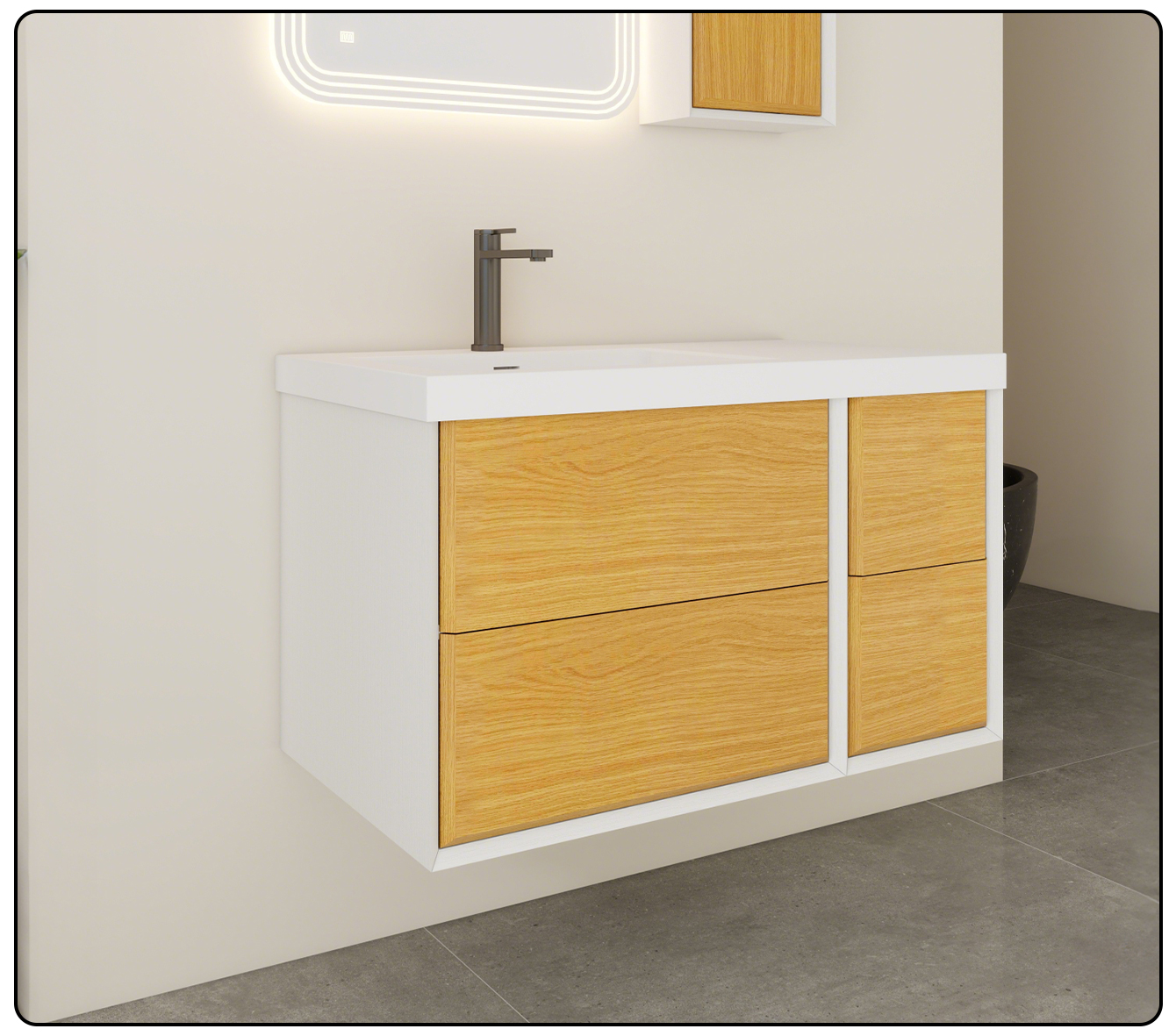 The set includes a full set of accessories such as bathroom cabinets, washbasins and faucets, which are suitable for large-sized bathroom layouts and are easy to install. The cabinet body is made of high-quality boards that are moisture-proof and durable. The hardware parts are finely polished, taking into account both appearance and durability. It creates a high-quality bathroom space that combines ceremony and practicality for large-sized apartments.