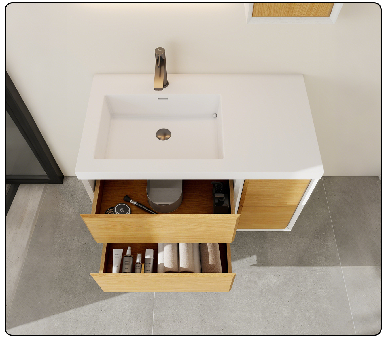 Moershu has been deeply engaged in the bathroom field for over three decades. This light luxury bathroom cabinet set is specially customized for large-sized apartments. It takes the artificial stone one-piece molding technology as the core and combines aesthetics with practicality. The countertop is made of eco-friendly artificial stone with seamless casting, which is non-toxic and non-radioactive. It is antibacterial, mold-proof, stain-resistant and scratch-resistant. Water stains and oil stains can be wiped off easily, solving the cleaning problem from the root.